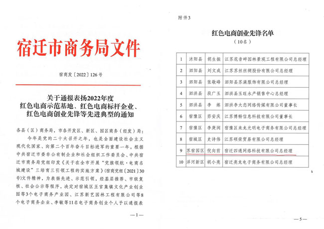 黨的二十大召開之年,市商務(wù)局為擦亮“電商名城”牌子,激發(fā)“電商名城”發(fā)展新動能,12月15日,組織紡織服裝產(chǎn)業(yè)鏈黨建工作暨“黨旗領(lǐng)航·電商名城建設(shè)”推進(jìn)會。園區(qū)企業(yè)家四通科技董事長倪向前獲得“紅色電商創(chuàng)業(yè)先鋒”榮譽(yù)稱號。