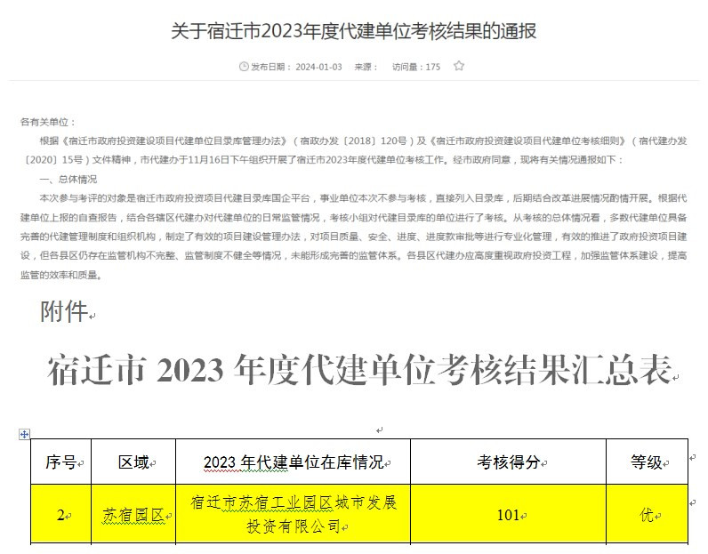 近日,經(jīng)市政府同意,由宿遷市政府投資建設(shè)項目代建管理辦公室通報宿遷市2023年度代建單位考核工作結(jié)果,城發(fā)公司以101分高分通過本次考核。